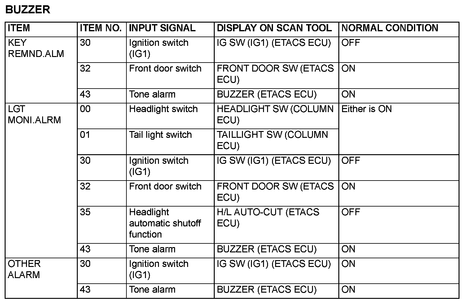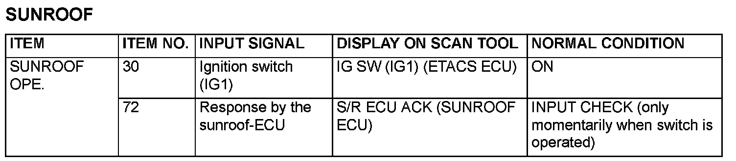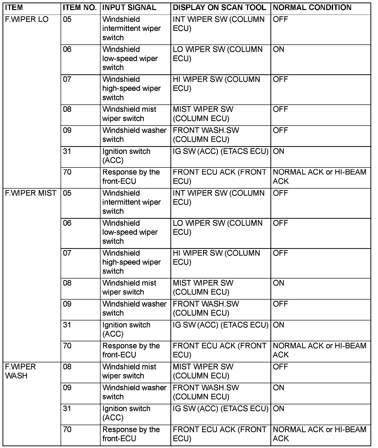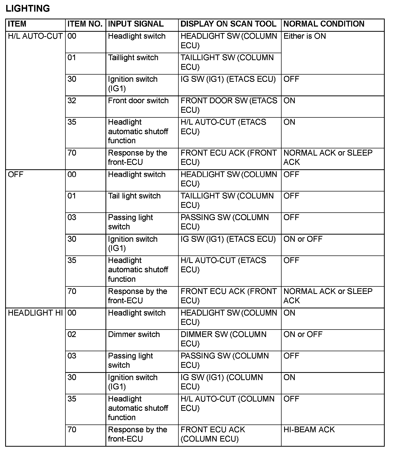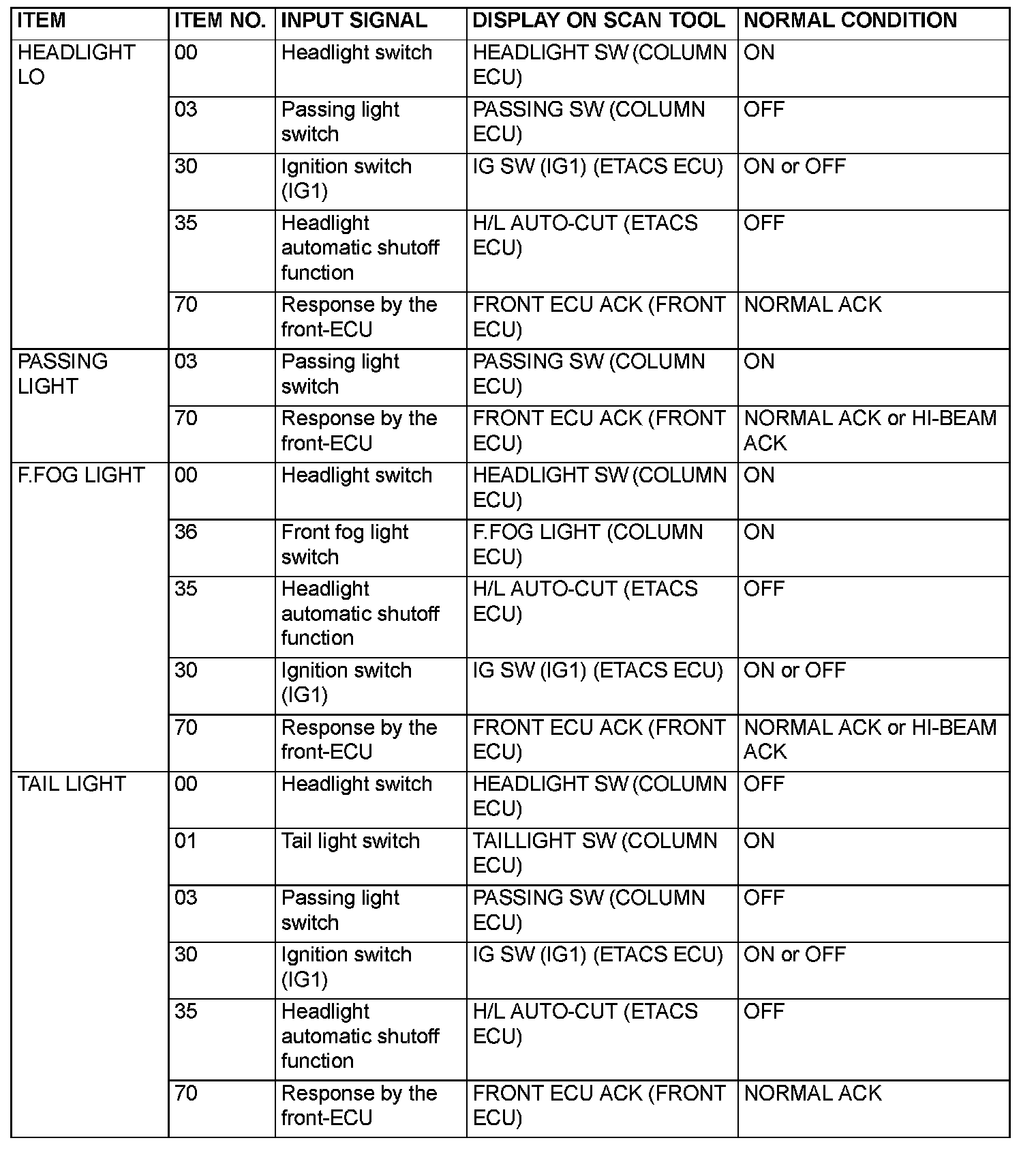 NOTE: When checking the input signals (off, tail, low-beam or high-beam), turn the ignition switch to the "ON" position in order to disable the headlight automatic shutoff function. However, since the headlight operation does not depend on the ignition switch positions, the scan tool MB991958 (M.U.T.-III Sub Assembly) does not display the title "IGNITION SWITCH".