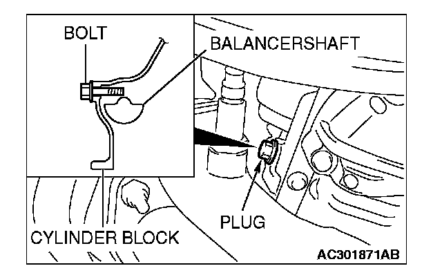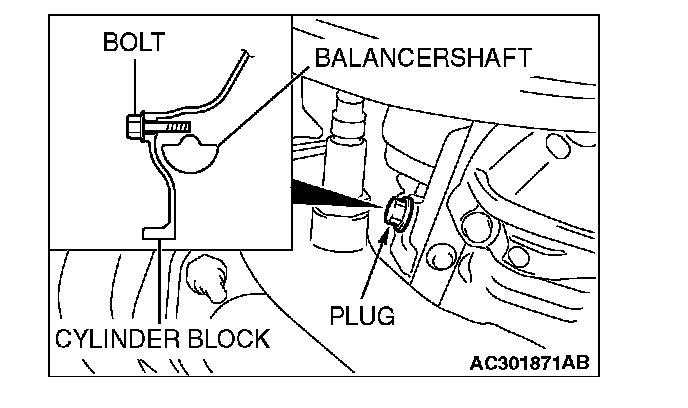 2. Adjust the timing mark of the engine oil pump sprocket. Unplug the cylinder block plug. Insert a bolt (M6, section width 10 mm, nominal length 45 mm) in the plug hole. If the bolt comes in contact with the balancer shaft, turn the engine oil sprocket one rotation. Re-adjust the timing mark and then check to see that the bolt fits. Do not remove the bolt until the valve timing belt is assembled.