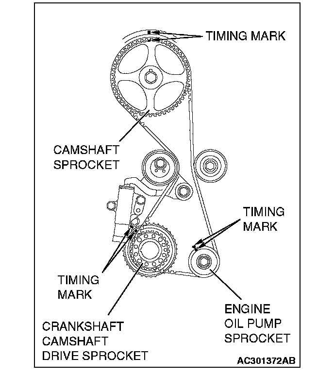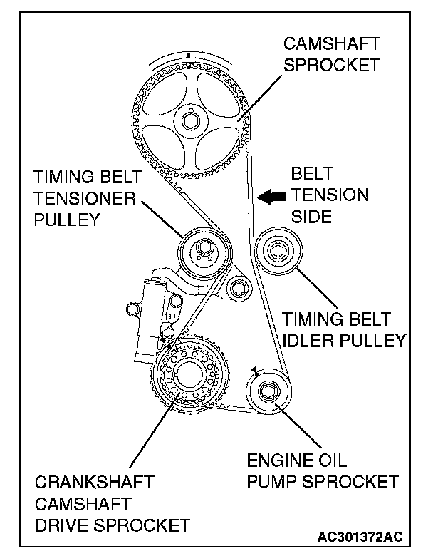 CAUTION: Install the valve timing belt. Then apply reverse rotation (counterclockwise rotation) pressure to the cam shaft sprocket. Re-check to see that each timing mark is aligned while the tension side of the belt is right.
