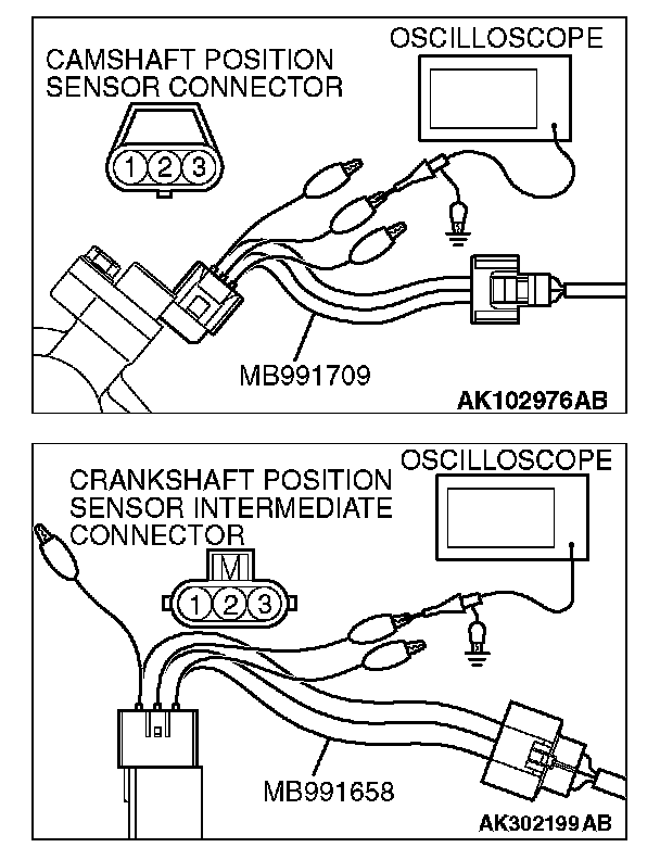 1. Disconnect the camshaft position sensor connector, and connect the test harness special tool (MB991709) between the separated connector (All terminals should be connected).