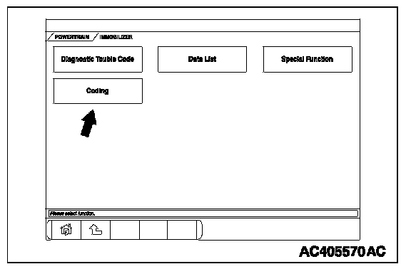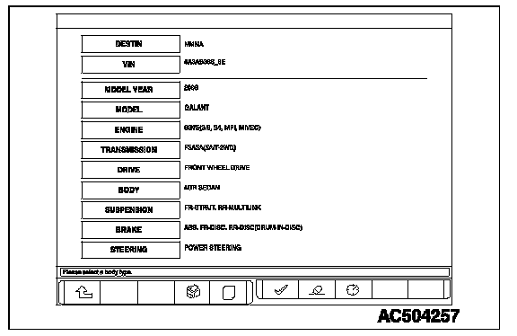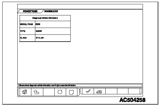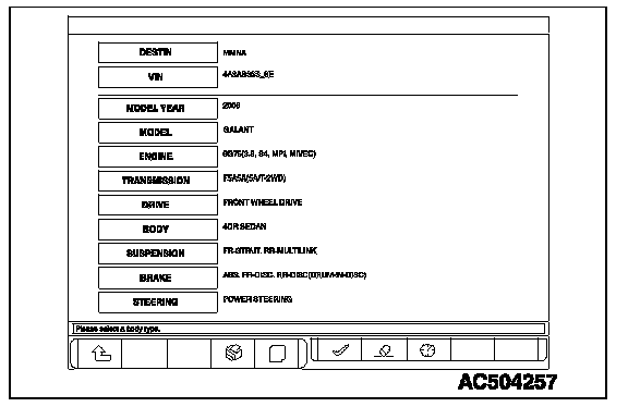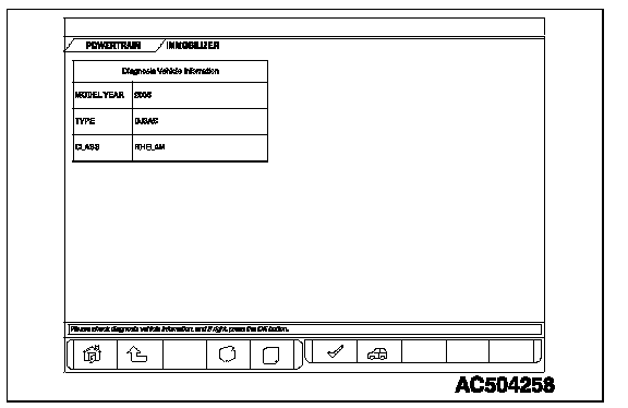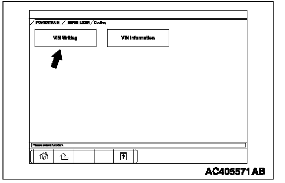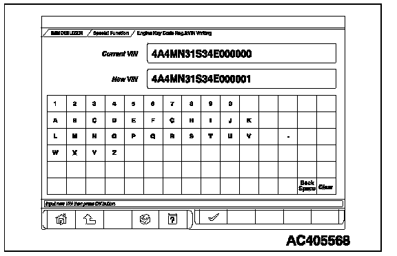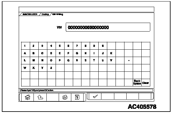 HOW TO PERFORM VEHICLE IDENTIFICATION NUMBER (VIN) WRITINGThe Vehicle Identification Number (VIN) is stored in the powertrain control module (PCM) by the vehicle manufacture. If the VIN to be stored in the PCM is eliminated fraudulently, the Malfunction Indicator Lamp (SERVICE ENGINE SOON or Check Engine Lamp) illuminates and Diagnostic Trouble Code (DTC) No.P0630 (VIN malfunction) is shown. When the PCM is replaced, and entry of the VIN necessary due to DTC No. P0630 (VIN malfunction). Enter the VIN in accordance with the procedure as follows: