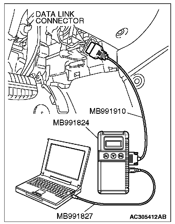 CAUTION: To prevent damage to scan tool MB991958, always turn the ignition switch to the "LOCK" (OFF) position before connecting or disconnecting scan tool MB991958.