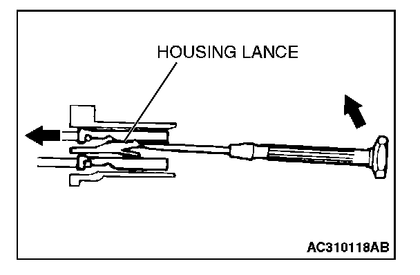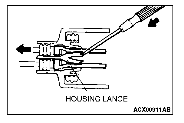 2. Insert the tip of the screwdriver [1.4 mm (0.06 inch) or 2.0 mm (0.08 inch) width] into the connector as shown in the figure, raise the housing lance slightly with the tip, and pull out the terminal.