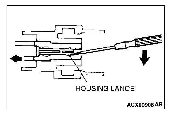 2. Insert the tip of a screwdriver [0.8 mm (0.03 inch) width] into the connector as shown in the figure, push it lightly to raise the housing lance, and pull out the terminal.
