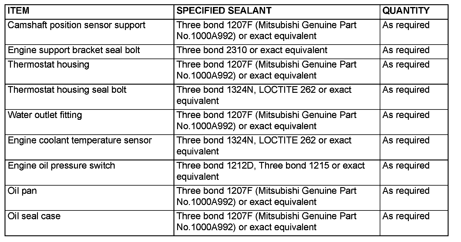This engine has several areas where the form-in-place gasket (FIPG) is used for sealing. To ensure that the FIPG fully serves its purpose, it is necessary to observe some precautions when applying it. Bead size, continuity and location are of paramount importance. Too thin a bead could cause leaks. Too thick a bead, on the other hand, could be squeezed out of location, causing blocking or narrowing of fluid passages. To prevent leaks or blocking of passages, therefore, it is absolutely necessary to apply the FIPG evenly without a break, while observing the correct bead size. FIPG hardens as it reacts with the moisture in the atmospheric air, and it is usually used for sealing metallic flange areas.