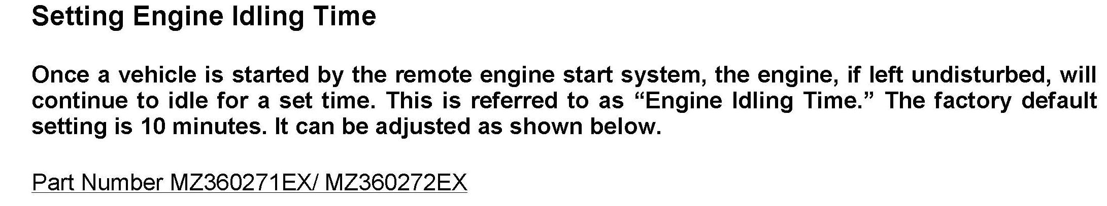 Remote engine start allows starting the engine from a distance before entering the vehicle. Use the Remote Engine Start transmitter to start or stop the engine. The engine will idle for a preset period of time (5 10 20 or 30 minutes) or when specific conditions are detected. The factory default is 10 minutes.