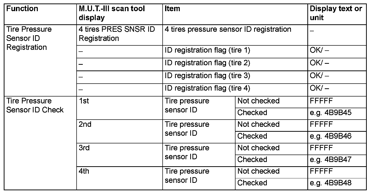 TPMS Special Function Data List