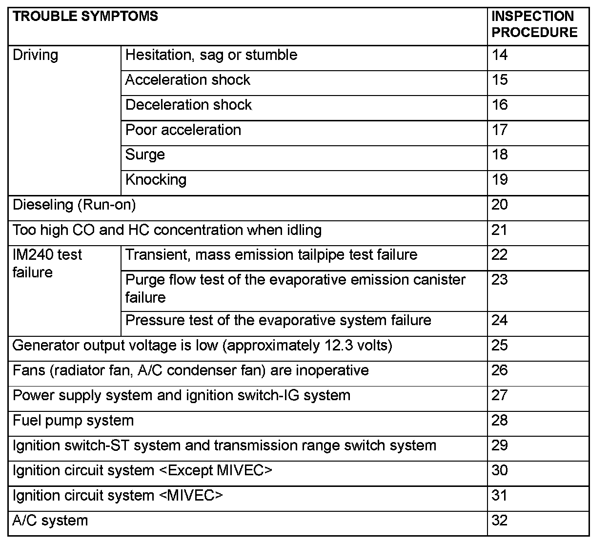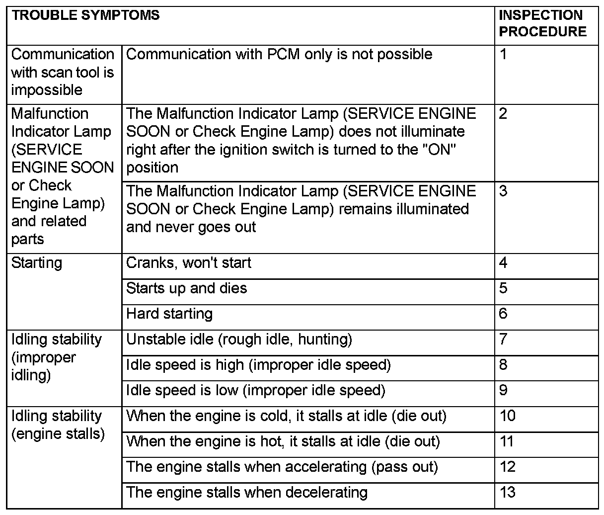 SYMPTOM CHARTWARNING: When touching the throttle valve, surely shut off the driving circuits of the throttle valve. In the event that the throttle valve is operated, a finger might be injured as the result of being caught by the throttle valve.