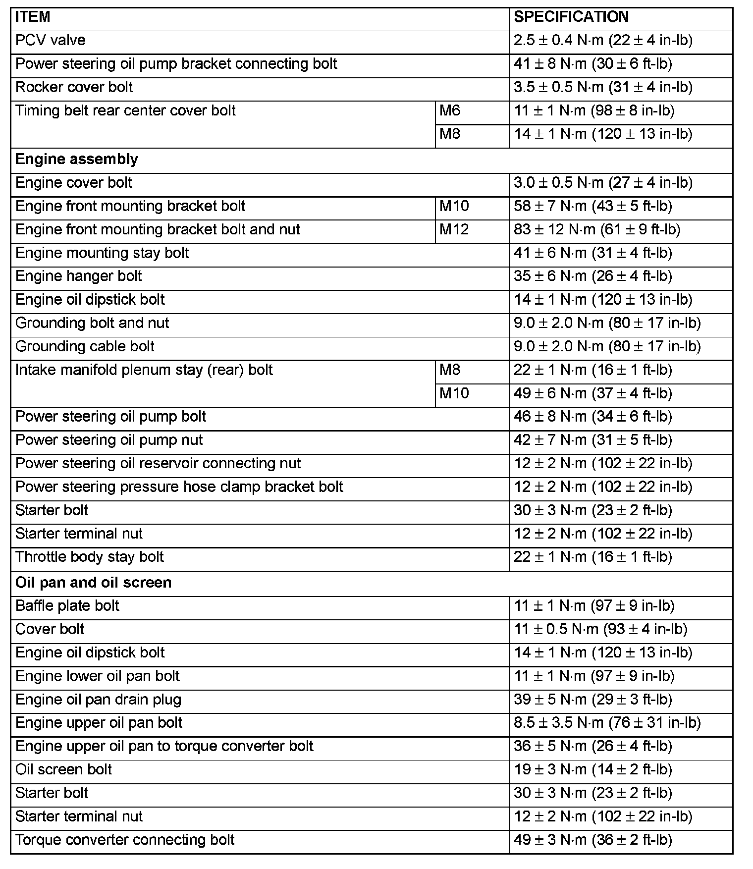 FASTENER TIGHTENING SPECIFICATIONS