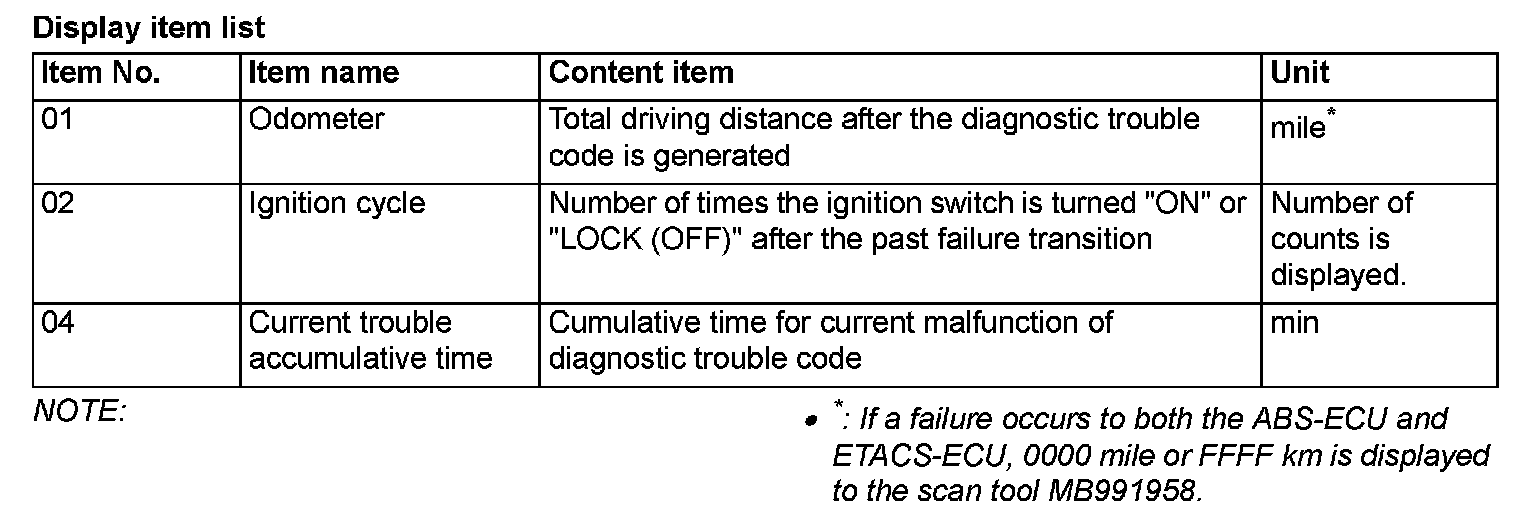 When detecting fault and storing the DTC, the ECU connected to CAN bus line obtains the data before the determination of the DTC and the data when the DTC is determined, and then stores the ECU status of that time. By analyzing the data from scan tool, the troubleshooting can be performed more efficiently. The displayed items are as shown in the table below.