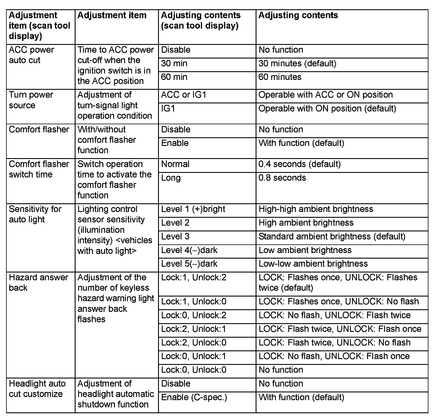 By operating the ETACS system or MMCS of scan tool MB991958, the following functions can be programmed. The programmed information is held even when the battery is disconnected.