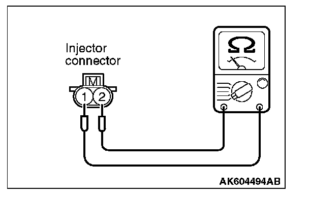 2. Measure the resistance between injector side connector terminals 1 and 2.