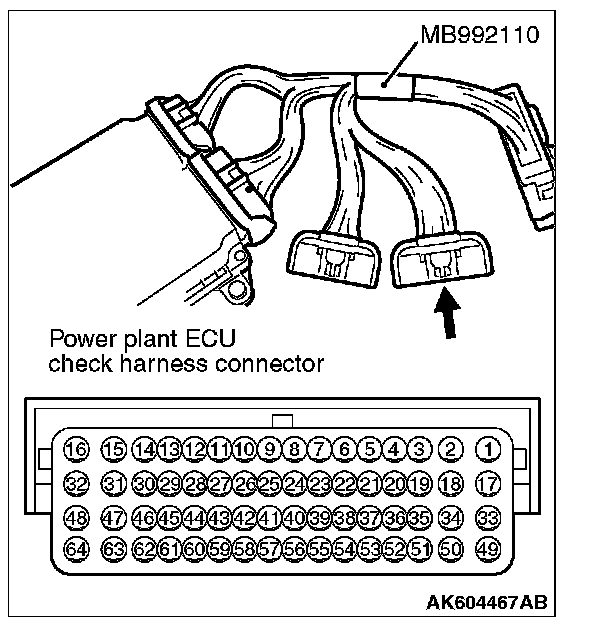 1. Disconnect all ECM connectors. Connect the check harness special tool (MB992110 between the separated connectors.