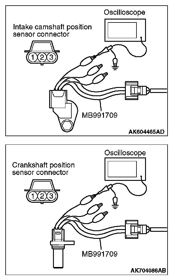 1. Disconnect the camshaft position sensor connector, and connect the test harness special tool (MB991709) between the separated connector (All terminals should be connected).