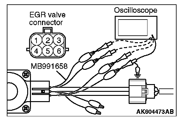 2. Connect the oscilloscope probe to the EGR valve connector terminal No. 1, terminal No. 3, terminal No. 4, terminal No. 6 respectively.