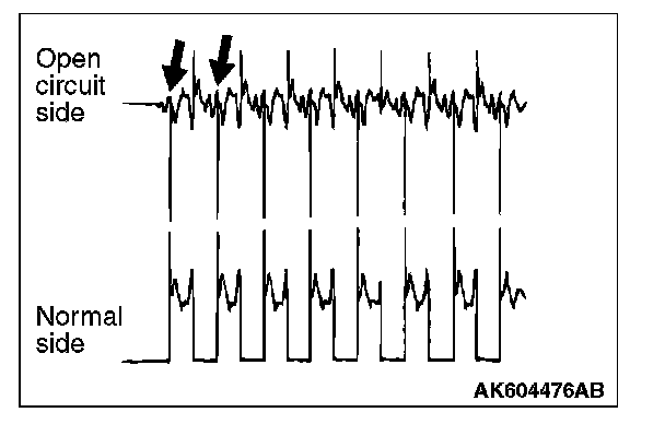- Current is not supplied to the motor coil on the open circuit side. (Voltage does not drop to 0 volt.) Furthermore, the induced electromotive force wave pattern at the normal side is slightly different from the normal wave pattern.