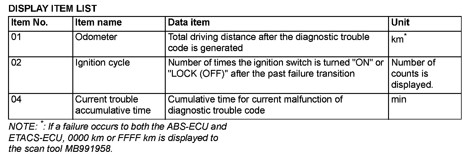 When detecting fault and storing the DTC, the ECU connected to CAN bus line obtains the data before the determination of the DTC and the data when the DTC is determined, and then stores the ECU status of that time. By analyzing each data from scan tool, the troubleshooting can be performed more efficiently. The displayed items are as the table below.