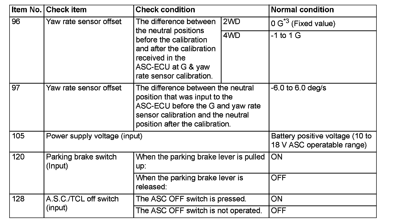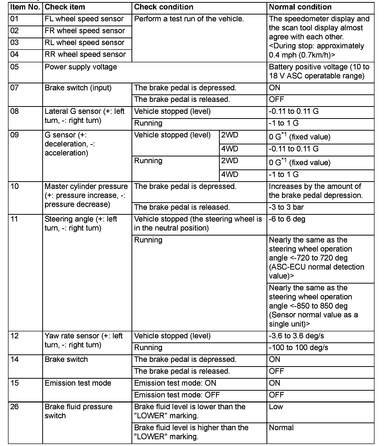 DATA LIST REFERENCE TABLEThe following items can be read by the scan tool from the ASC-ECU input data.