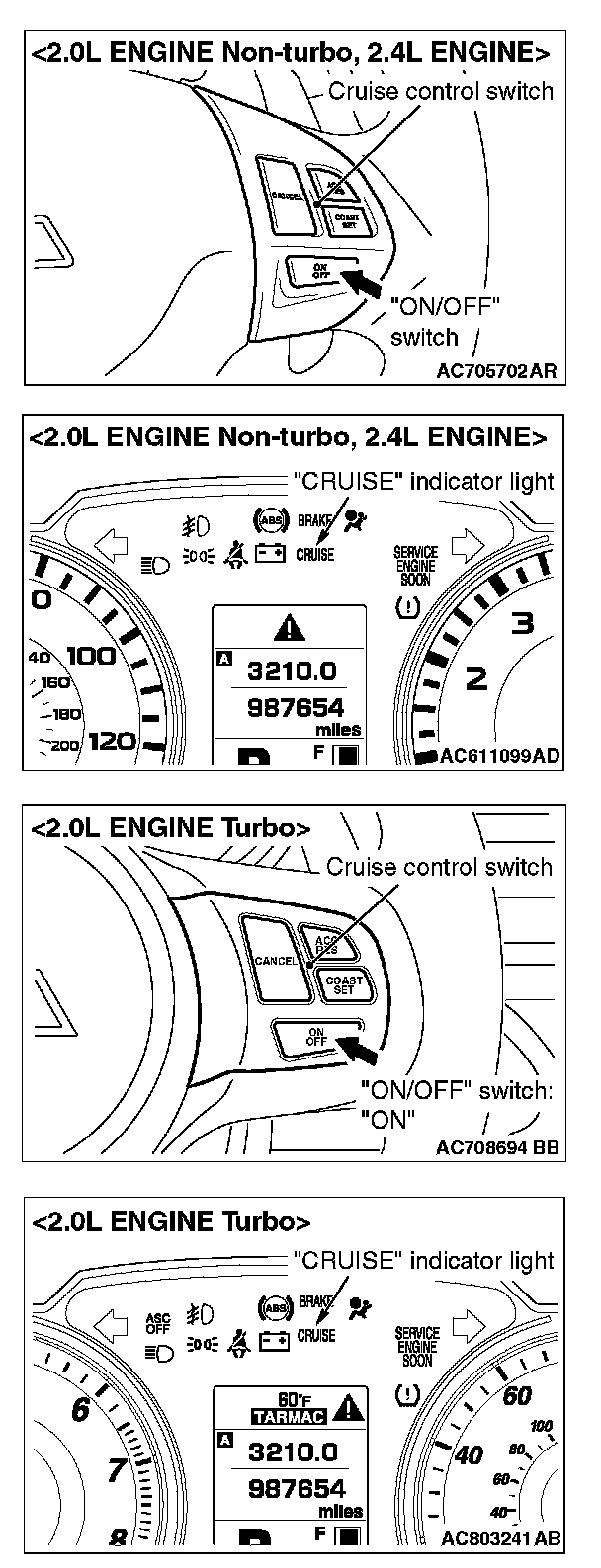 1. Press the "ON/OFF" switch (cruise control system: ON, "CRUISE" indicator light: illuminated.)