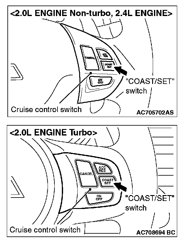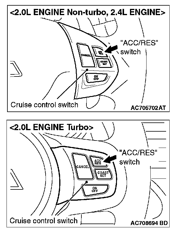 4. Check to be sure that acceleration continues while the "ACC/RES" switch is pressed, and that the speed at the time it was released becomes the constant driving speed.