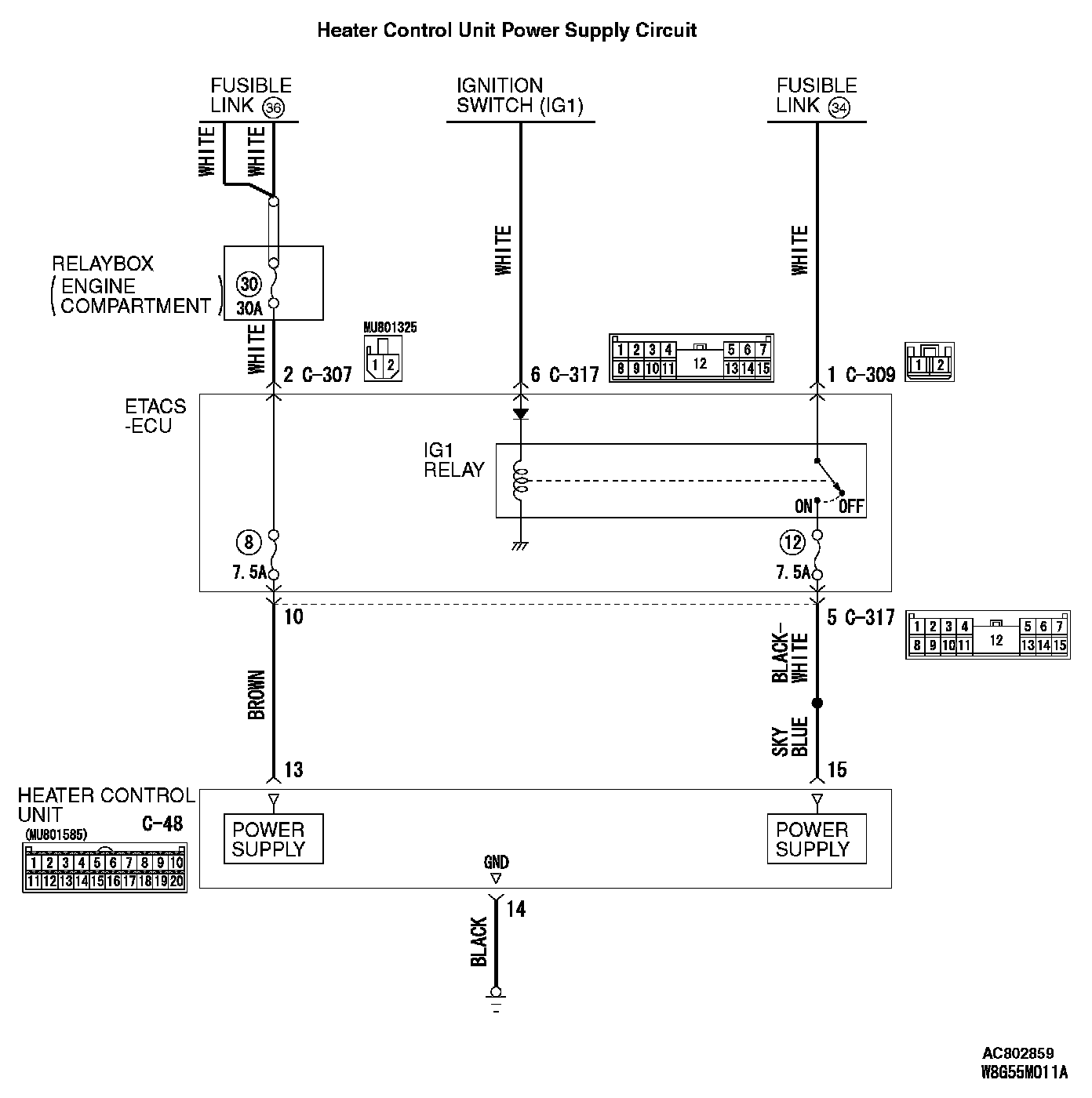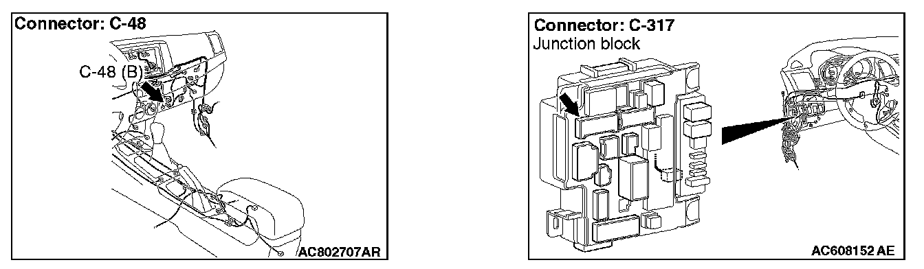 STEP 4. Check the wiring harness between heater control unit connector C-48 (terminal 15) and ETACS-ECU connector C-317 (terminal 5).