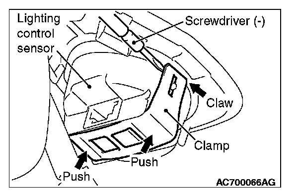 While pushing the clamp to the windshield side, pry up the clamp to disengage the right and left claws using the screwdriver (-), and then remove the lighting control sensor.