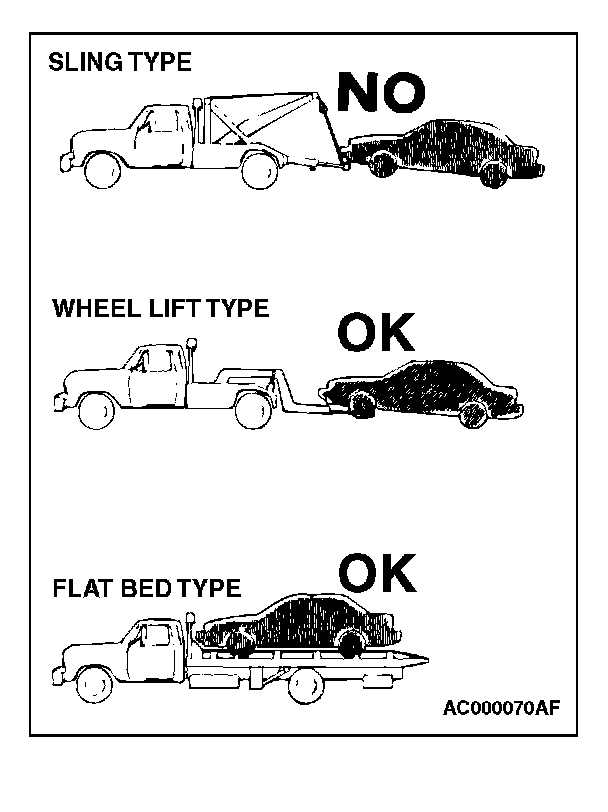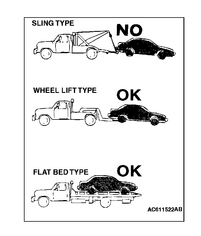 This vehicle cannot be towed by a wrecker using sling-type equipment; otherwise the bumper may become deformed. If this vehicle is towed, use wheel lift or flat bed equipment.
