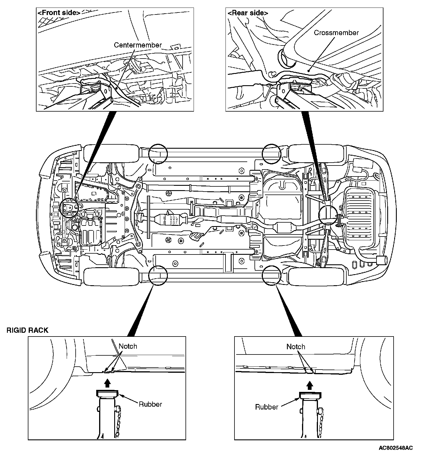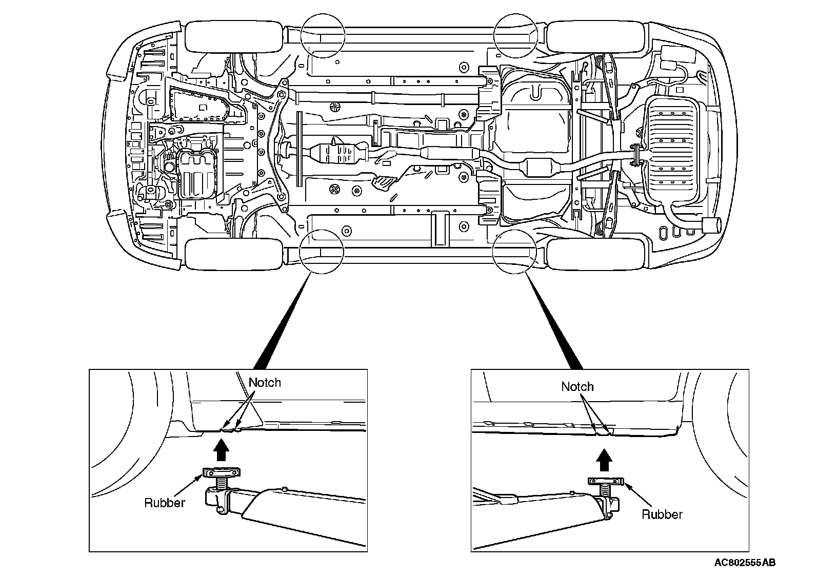 ^ For lifting, put rubber or similar material between the side sill and rigid rack, otherwise the side sill area will be damaged.