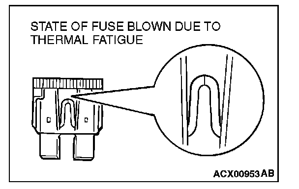 CAUTIONS IN EVENT OF BLOWN FUSEWhen a fuse is blown, there are two probable causes. One is that it is blown due to flow of current exceeding its rating. The other is that it is blown due to repeated on/off current flowing through it. Which of the two causes is responsible can be easily determined by visual check as described below.