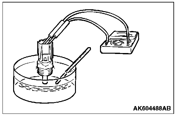 2. With the temperature sensing portion of engine coolant temperature sensor immersed in hot water, check the resistance.