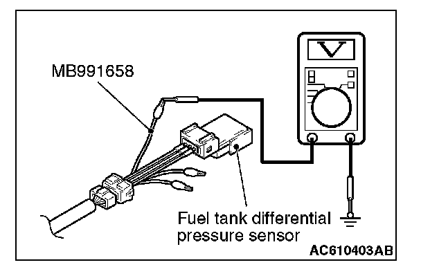 1. Disconnect the fuel tank differential pressure sensor connector and connect special tool MB991658 between the terminals of the disconnected connector.