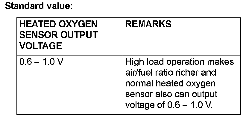 - If the temperature of sensing area does not reach the high temperature [of approximately 400 °C (752 °F) or more] even though the heated oxygen sensor is normal, the output voltage would be possibly low in spite of the rich air-fuel ratio.