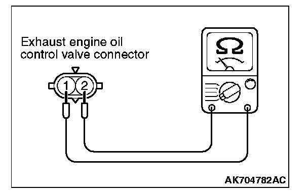 2. Measure resistance between terminal No. 1 and terminal No. 2 of the connector at the exhaust engine oil control valve side.
