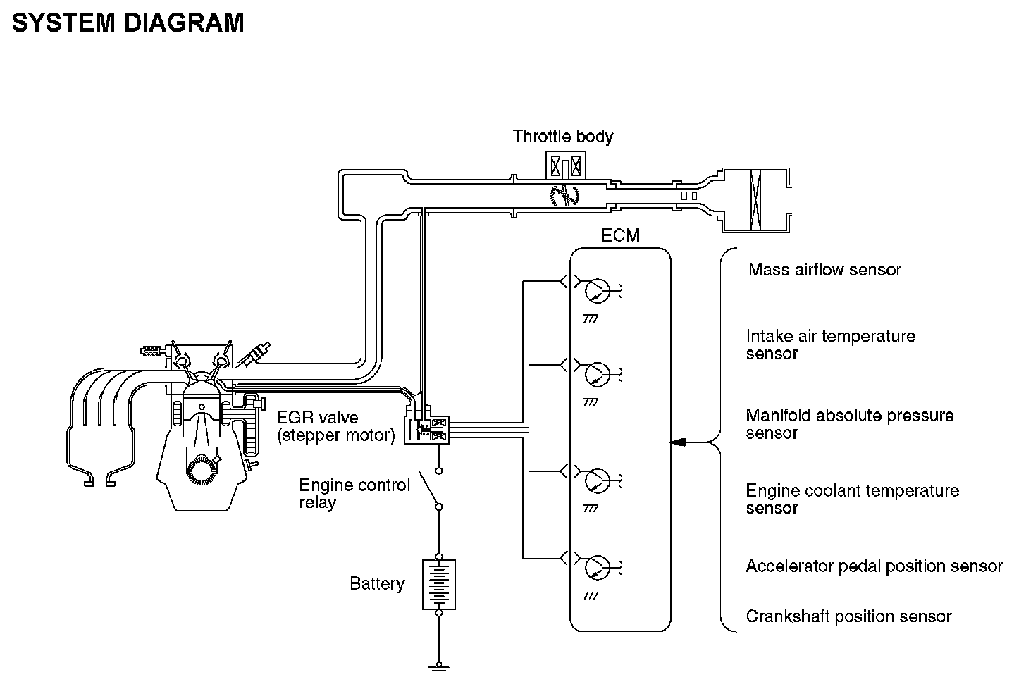 The exhaust gas recirculation system (EGR) lowers the nitrogen oxides (NOx) emission level. When the air/fuel mixture combustion temperature is high, a large quantity of NOx is generated in the combustion chamber. Therefore, this system recirculates part of exhaust gas from the exhaust port of the cylinder head to the combustion chamber through the intake manifold to decrease the air/fuel mixture combustion temperature, resulting in reduction of NOx. The EGR flow rate is controlled by the EGR valve (Stepper Motor) for driveability quality.