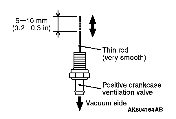 3. Hold the PCV valve with the vacuum side down. Insert a thin rod, and using light pressure, depress the end of the PCV valve spring by 5 - 10 mm (0.2 - 0.3 inch). Release pressure on the rod to see if the PCV valve spring will lift the rod to its original position.