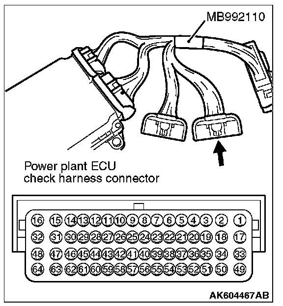 1. Disconnect all ECM connectors. Connect the check harness special tool (MB992110) between the separated connectors.