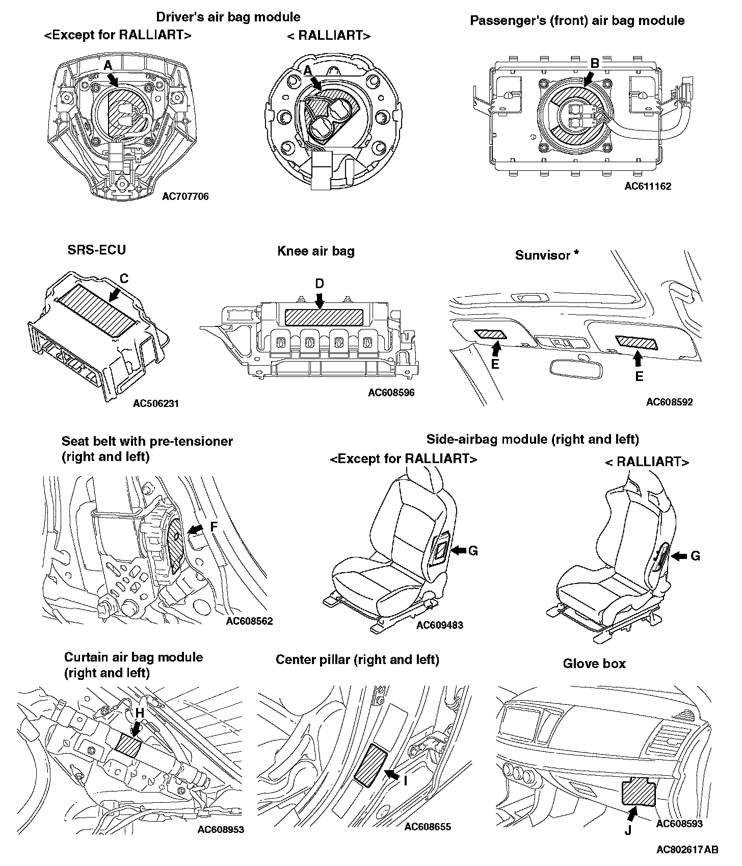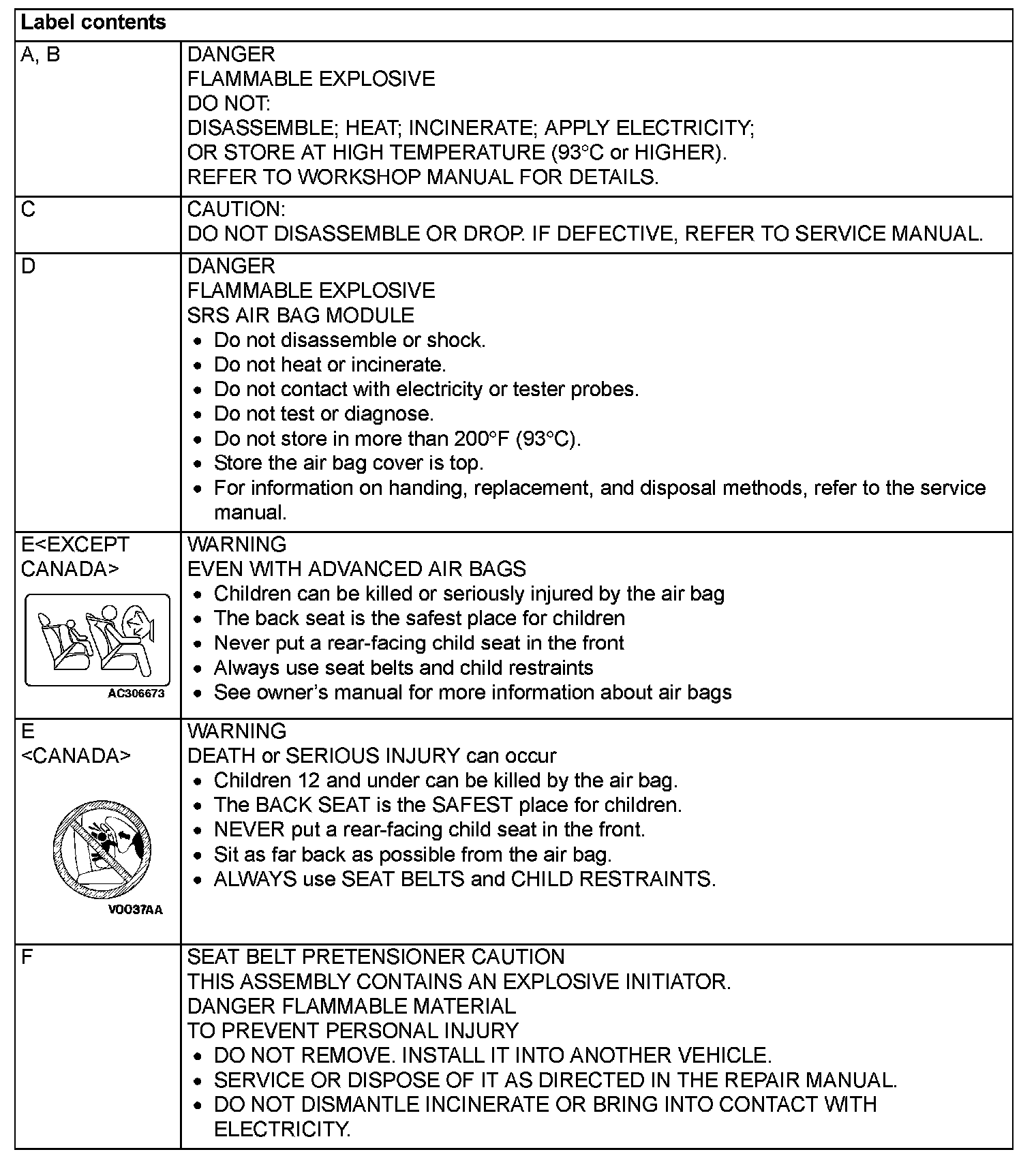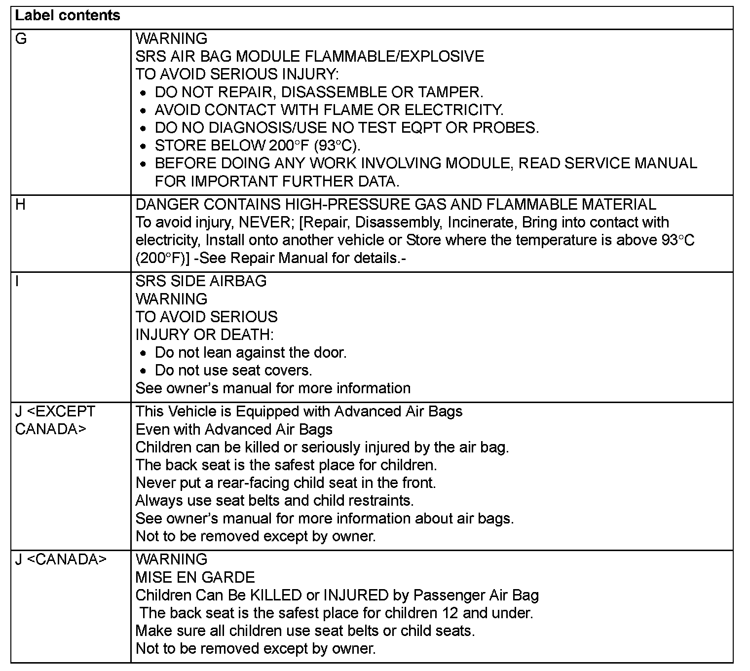 WARNING/CAUTION LABELSA number of caution labels related to the SRS are found in the vehicle, as shown in the following illustrations. Follow label instructions when servicing SRS. The label I is not to be removed except by owner. If the other labels are dirty or damaged, replace them.