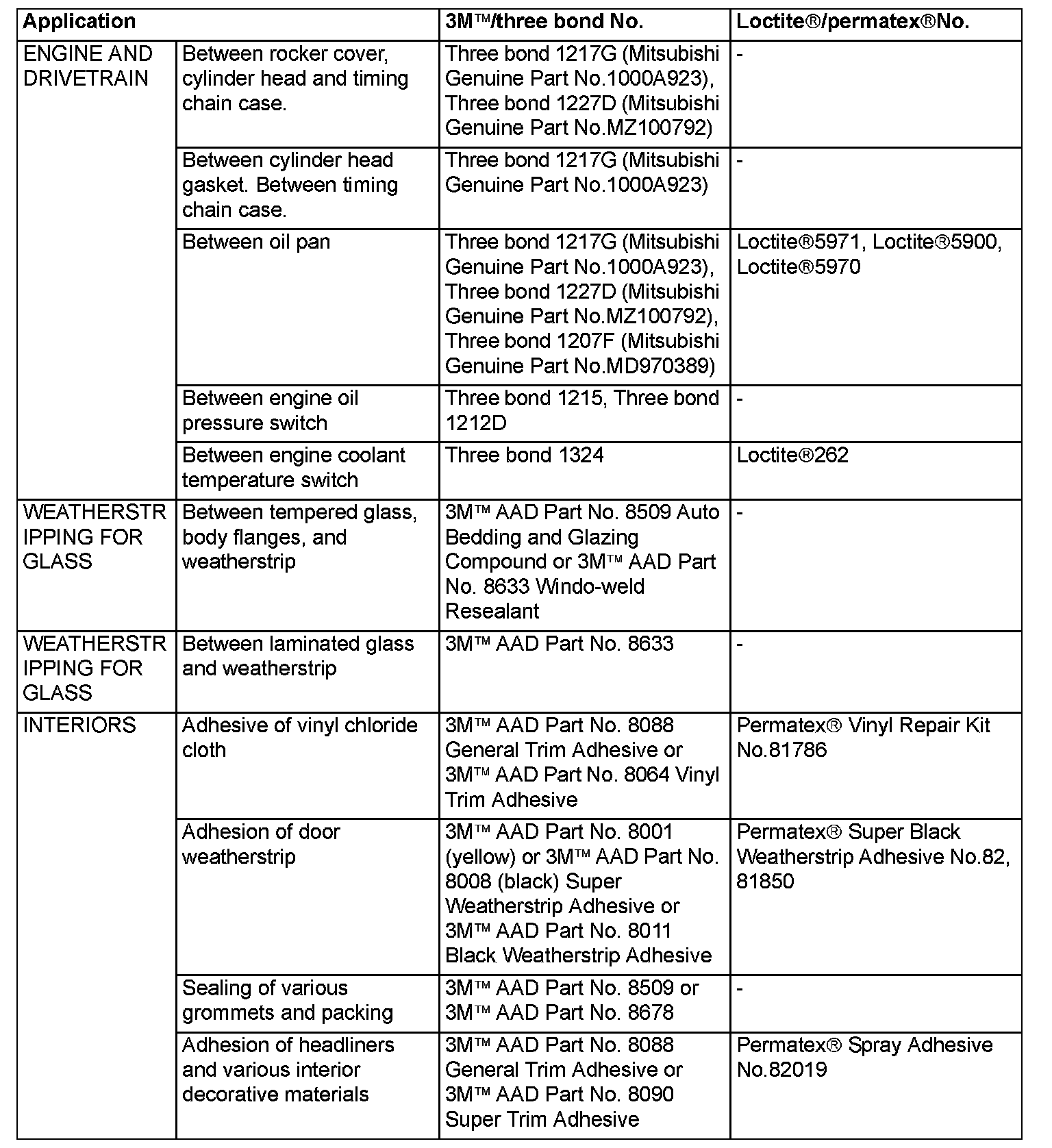 Main Sealant and Adhesive Table