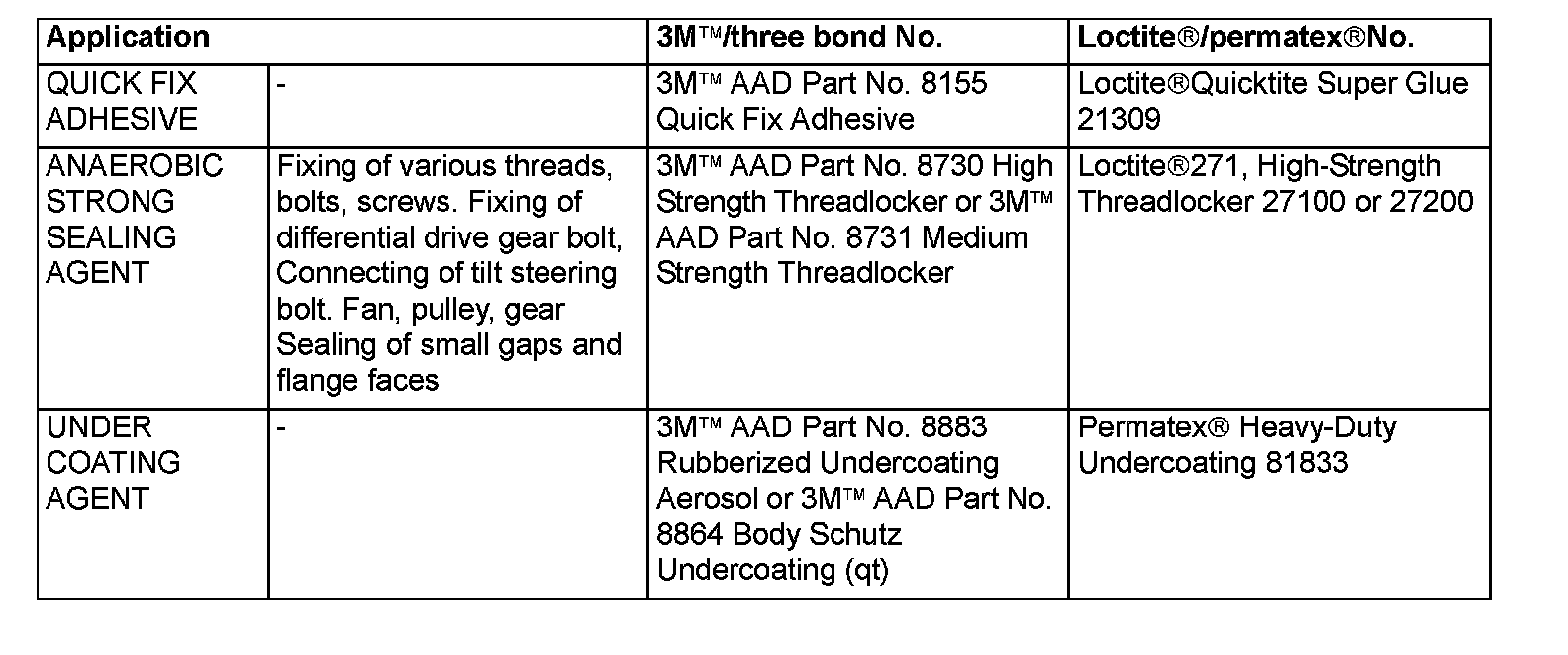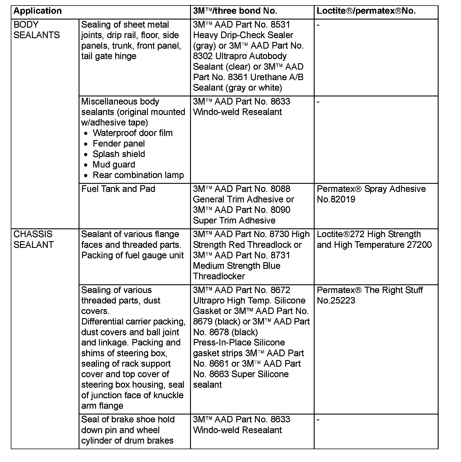MAIN SEALANT AND ADHESIVE TABLE