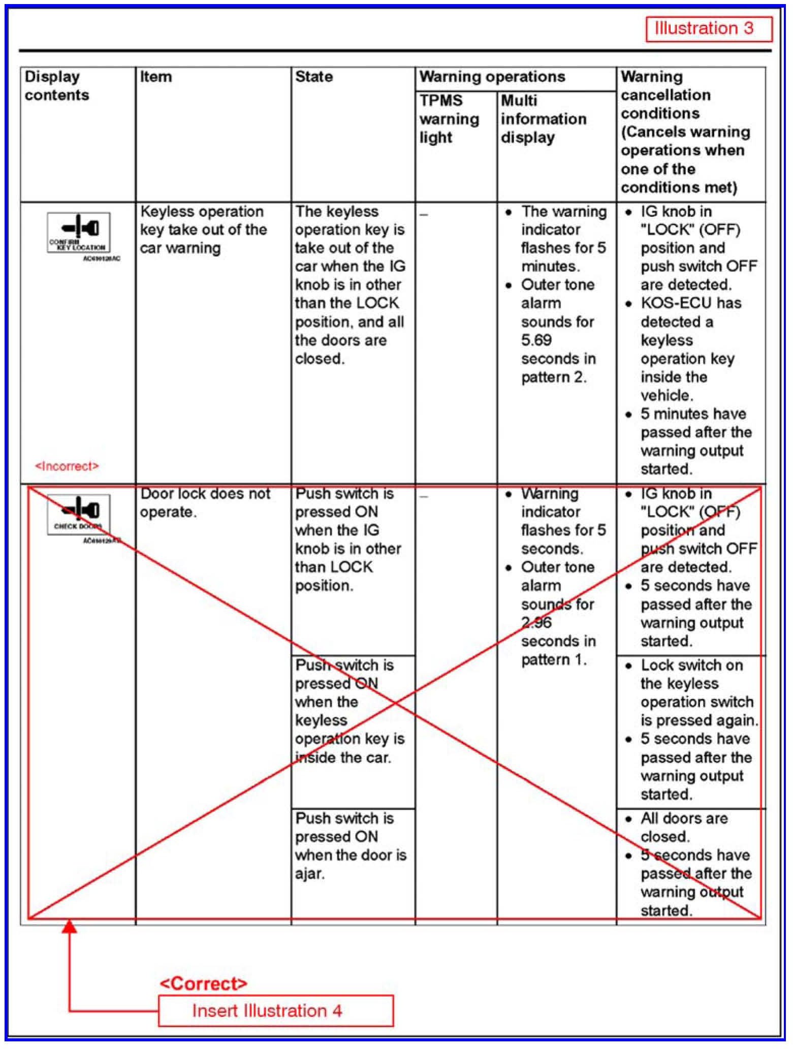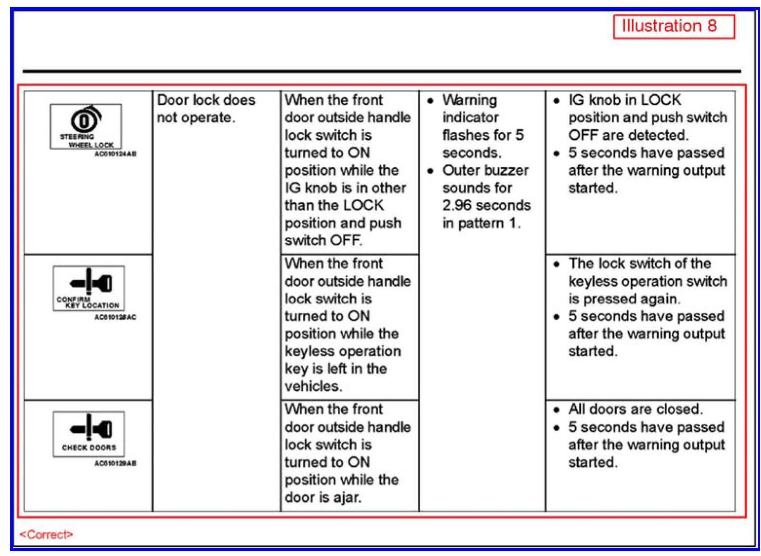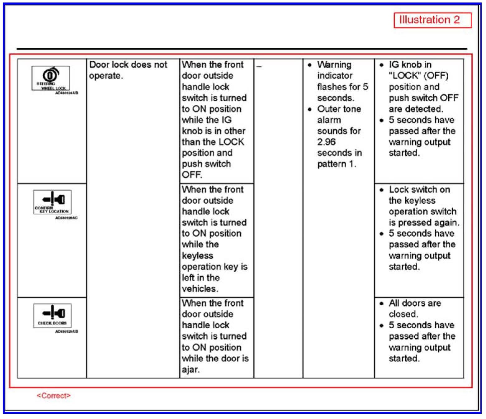 ^ The sentences explaining the warning state are corrected from; "push switch", to; "front door outside handle lock switch."