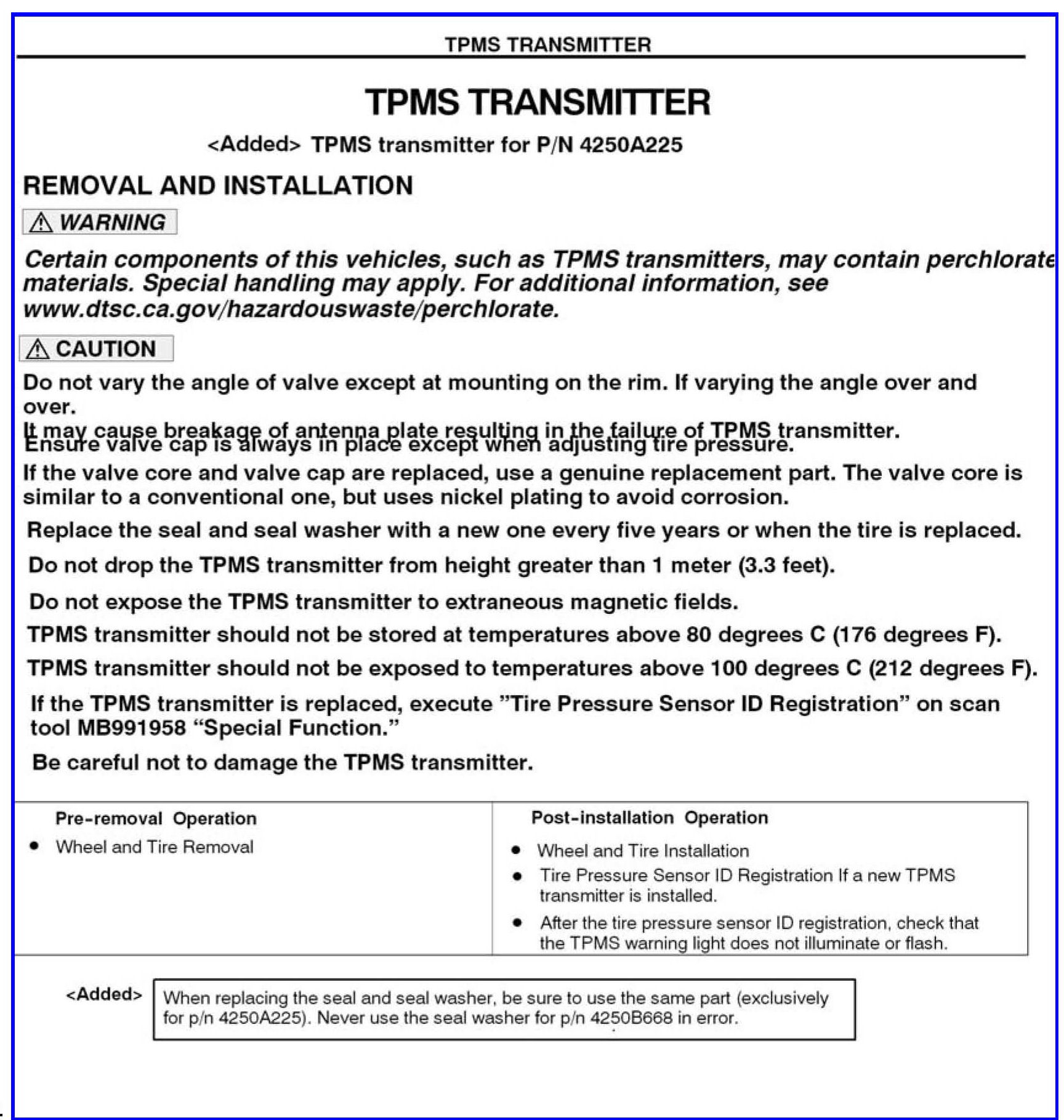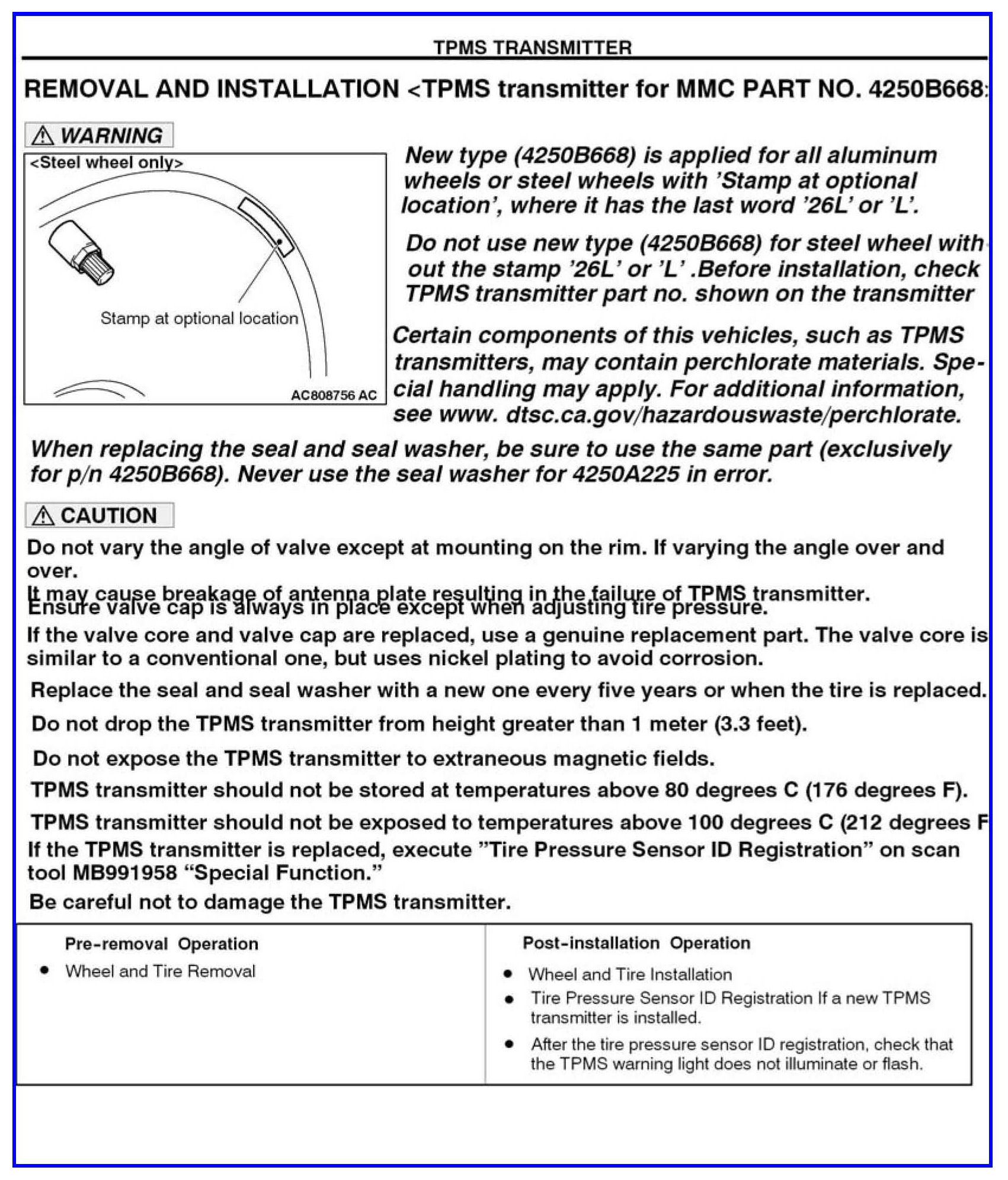 A new type of Tire Pressure Monitor System (TPMS) transmitter is installed on affected vehicles produced after mid-July 2009. Removal and installation procedures for the new TPMS transmitter (p/n 4250B668) are different than for the previous transmitter (p/n 4250A225).