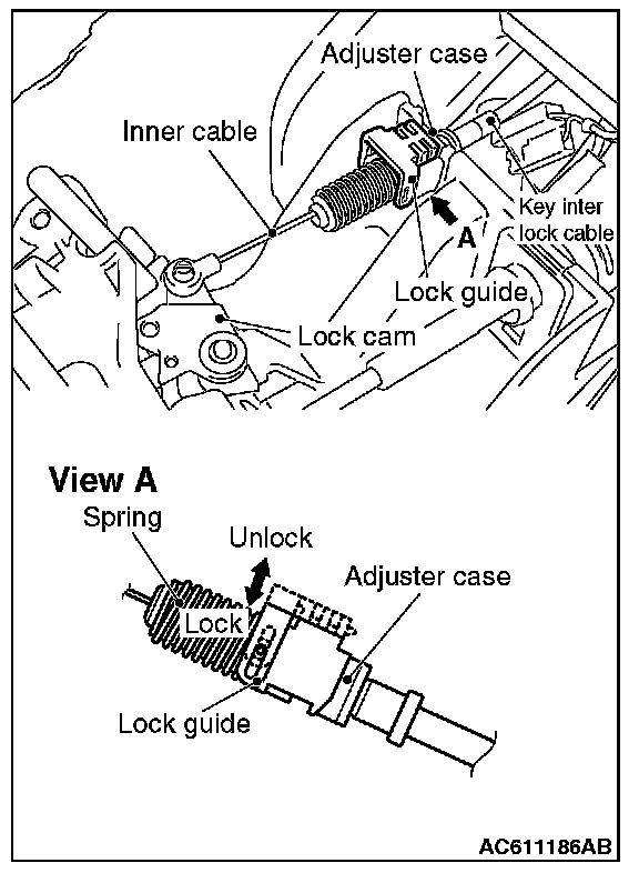 3) Install the tip of the key interlock cable to the lock cam of the selector lever assembly, taking care not to twist the inner cable.