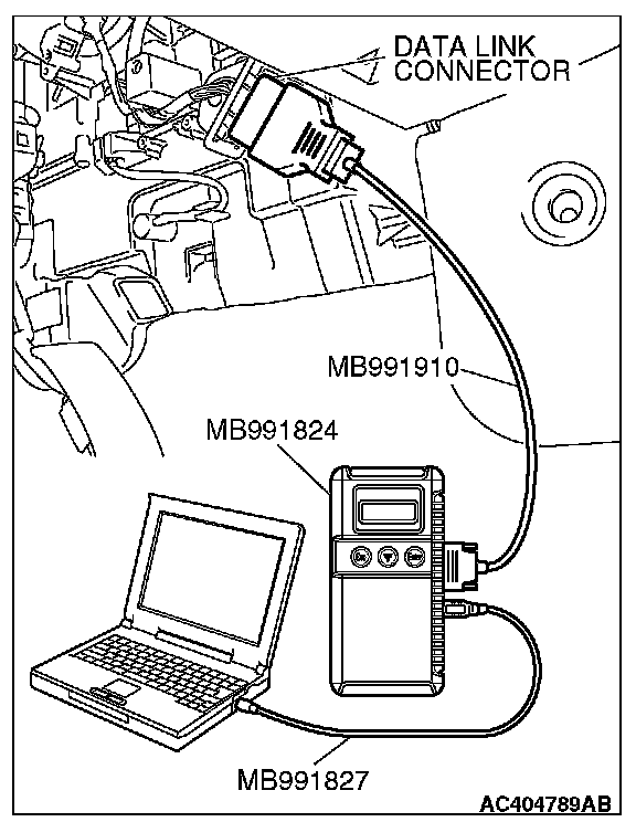 CAUTION: To prevent damage to scan tool MB991958, always turn the ignition switch to the "LOCK" (OFF) position before connecting or disconnecting scan tool MB991958.