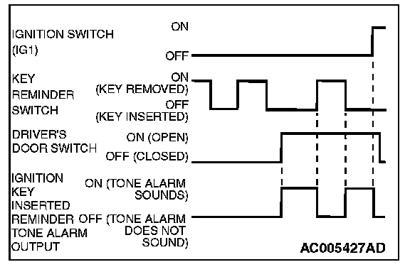 When the driver's door is opened with the ignition key inserted in the ignition key cylinder (ignition switch is in the OFF position,) the tone alarm sounds intermittently to indicate that the ignition key has not been removed.