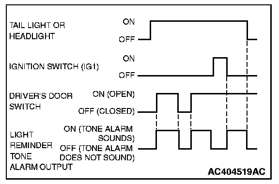 When the taillights or headlights are ON, if the ignition key is removed and the driver's door is opened, a tone alarm will sound continuously to warn that the lights are on. However, if the taillights or headlights have been turned off by the headlight automatic-shutoff function, the tone alarm will not sound.