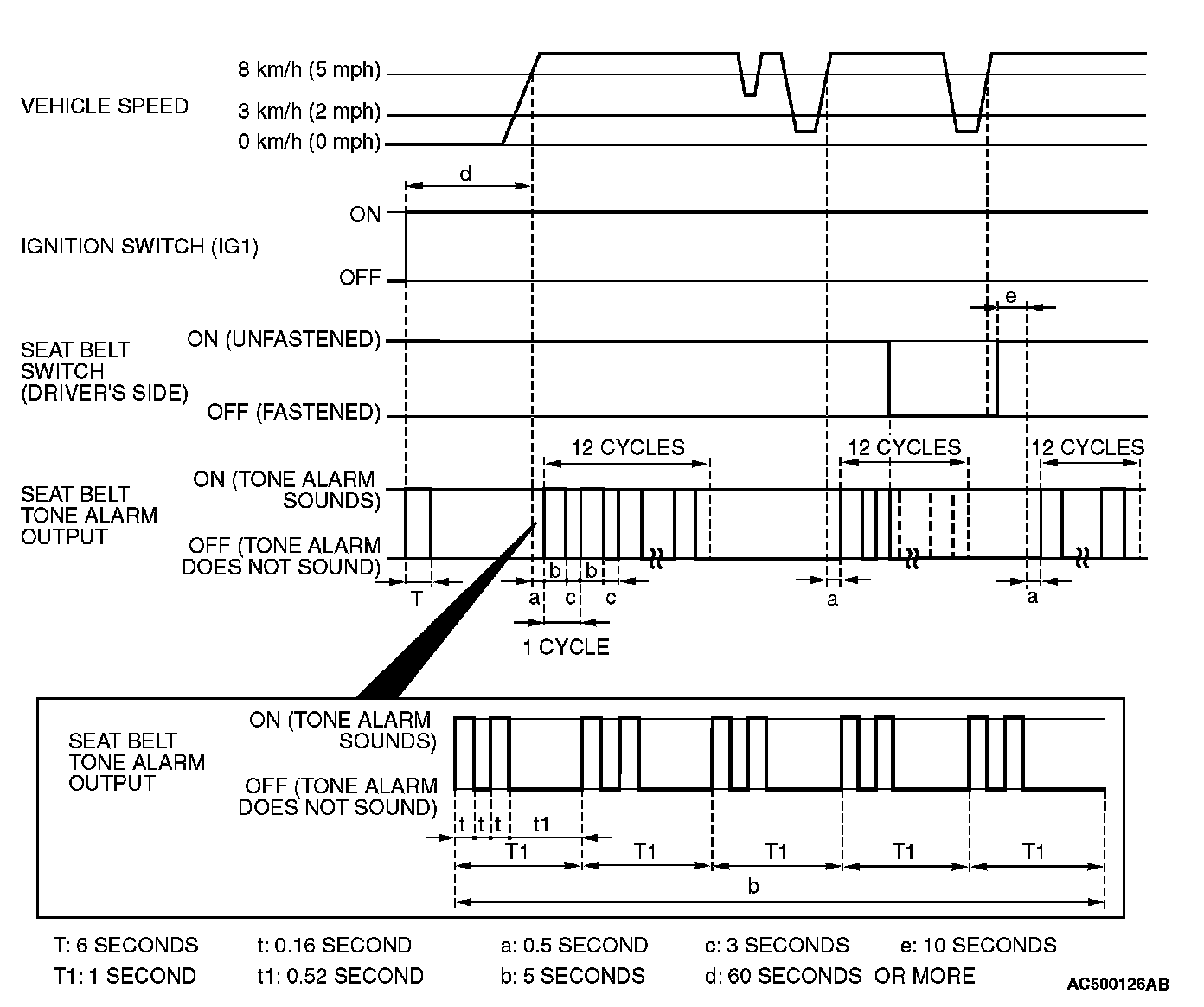 - Sounds the tone alarm 12 cycles (after 0.5 second) if any of the following conditions are met when 60 seconds or more have elapsed since the ignition switch is turned "ON". One cycle consists of 5 seconds "on" and then 3 seconds "off".
