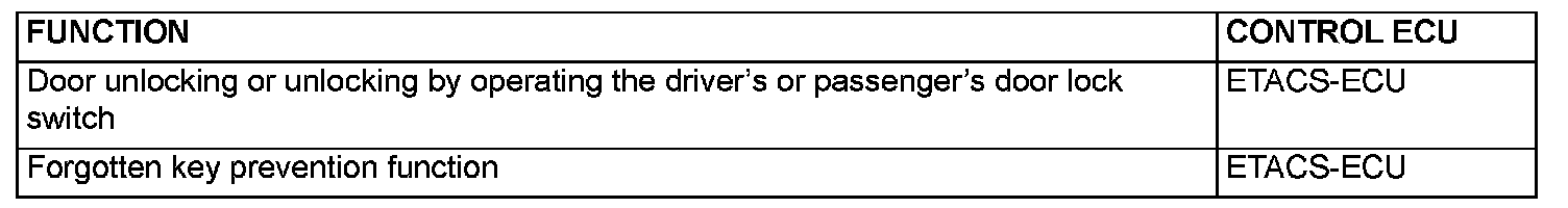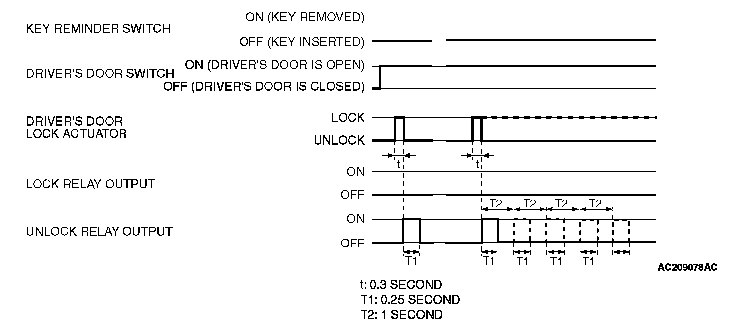 If the driver's door is locked while it is open and when the key is still in the ignition key cylinder, approximately 0.3 second later the ETACS-ECU activates the unlock relay output for 0.25 second to prevent the door from being locked with the key inside the vehicle.
