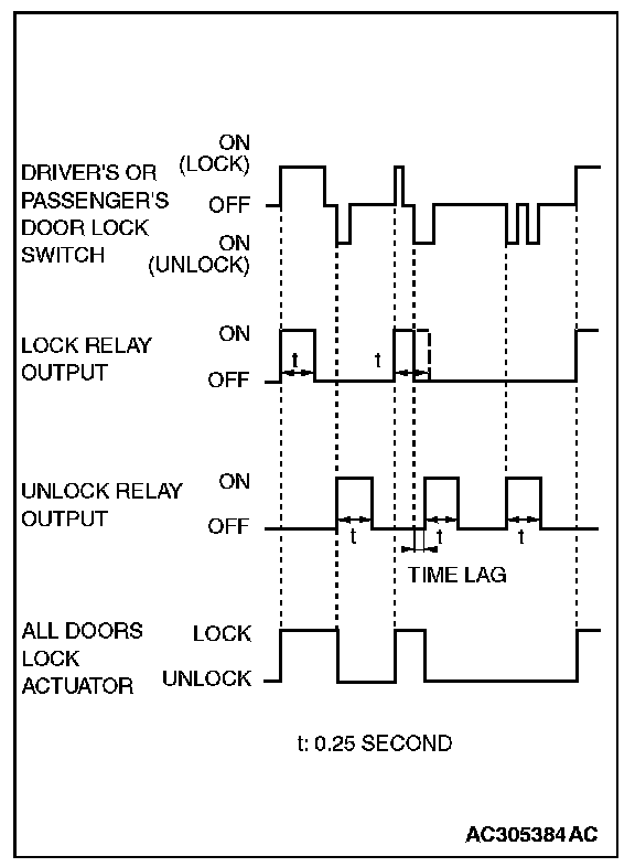 When the door is locked and unlocked by driver's or passenger's door lock switch consecutively, the ETACS-ECU operates its door lock relay and passes a current through the door lock actuators of all doors for 0.25 second to lock all doors. Then, the ETACS-ECU operates its door unlock relay and passes a current through the door lock actuators of all doors for 0.25 second to unlock all doors. Due to this, there may be a time lag between the driver's or passenger's door lock switch actuation and the time when all doors are unlocked.