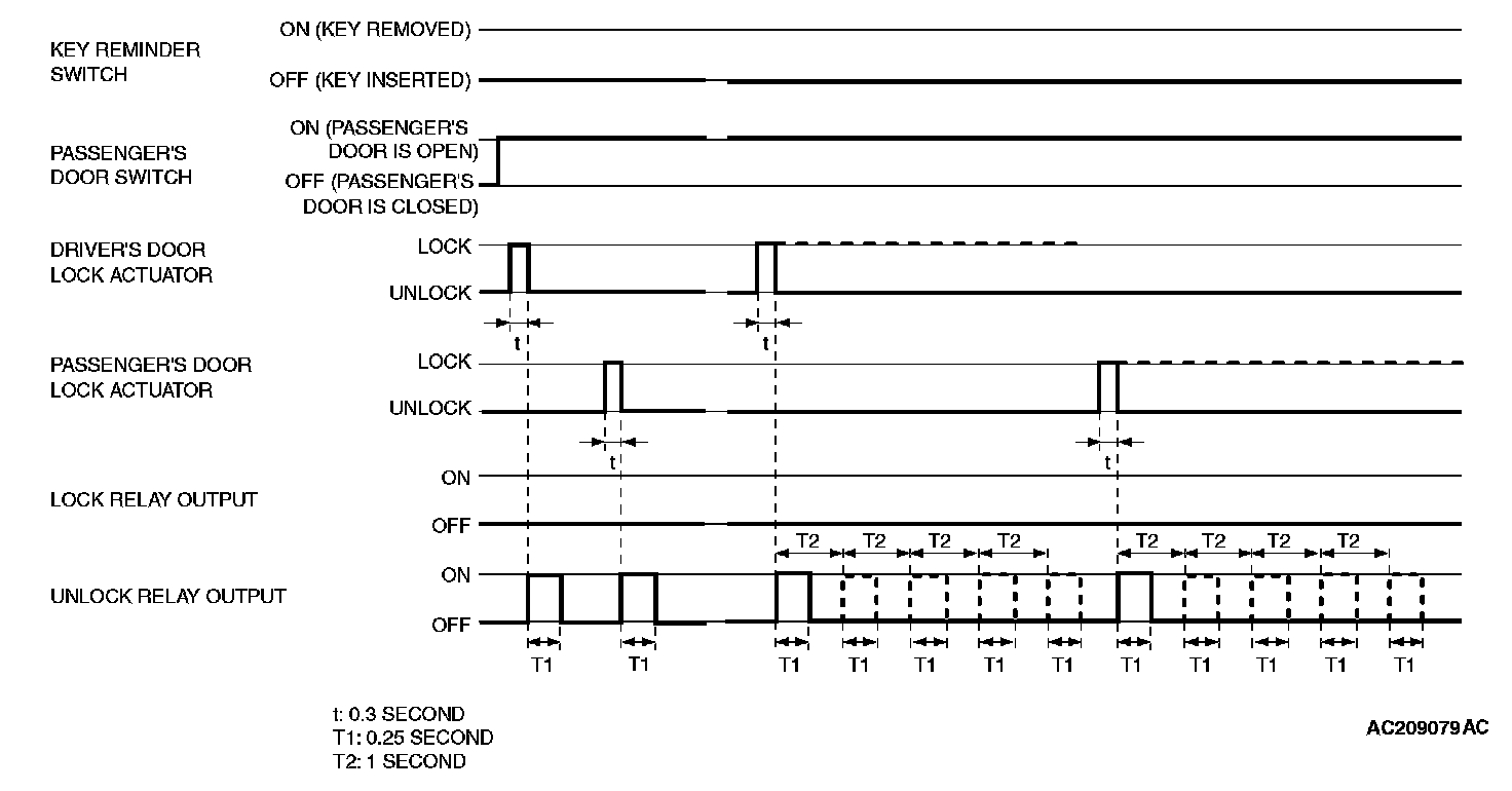 If the passenger's door or driver's door are locked while the passenger's door is open and when the key is still in the ignition key cylinder, approximately 0.3 second later the ETACS-ECU activates the unlock relay output for 0.25 second to prevent the door from being locked with the key inside the vehicle.