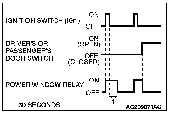 Even after the ignition is switched off, the ETACS-ECU keeps the power window relay activated for approximately 30 seconds, enabling raising or lowering of the power windows by using the power window switches. After approximately 30 seconds, the power window relay is deactivated. During this timed operation, if the driver's or passenger's doors are opened, the power window relay is deactivated from that moment.